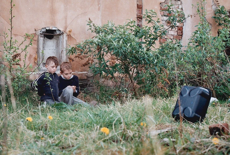 Dialogue in the film is minimal, but often a gateway to off screen action not entirely described by the visuals alone. The sound of children playing in the foreground, and an almost subconscious sound of distant adult screams, suggests an awful anti-paradise which draws you in.